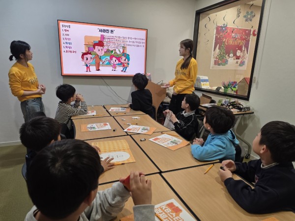 1차시 화폐가 태어났어요 이론 강의(조은빈): 자기 소개를 한 후, '사라진 돈' 이야기를 아이들과 함께 읽으며 물물교환의 불편함에 대해 토론해보았습니다. 물물교환에 관한 간단한 이론 설명과 교환 게임을 통해서 화폐의 필요성을 배웠습니다.