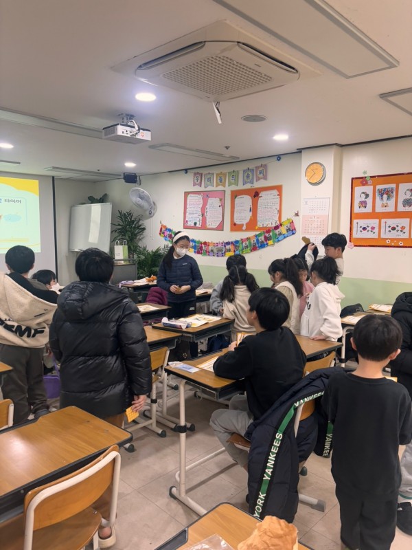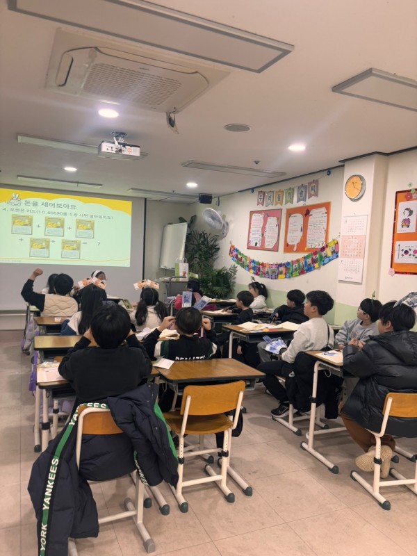 2교시(강유빈) : 앞서 배운 내용을 바탕으로 우리나라 화폐를 직접 그려보는 시간을 가졌다. 다만, 화폐에 포함된 영어 표기를 적는 부분에서 학생들이 낯설어하고 시간이 지체되는 모습을 보였다. 화폐 묘사에 몰입하다 보니 예정된 머리띠 만들기 시간이 부족하여 활동을 다소 서두르게 된 점이 아쉬웠다. 그래도 ‘17,000원!’이라고 하면 문제에 맞는 돈을 머리에 쓰고 있는 아이들이 손을 들며 재미있게 참여해서 좋았다.