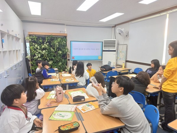 2교시에는 초등학생 친구들이 학교 영어 시간에 보통 진행하는 게임을 진행하였다. 팀을 꾸려 팀마다 돌아가면서 피피티에 있는 박스를 선택하여 해당 박스의 질문에 대해서 생각하고 응답하여 무작위 보상을 받는 게임을 진행하였다. 여기에 아동센터 센터장님께서 아이들이 알았으면 하는 내용에 대한 질문을 넣는 등 수업에서 들었던 내용뿐만 아니라 다방면으로 돈에 대해서 생각해 보고 경제의 선순환에 대해서 생각해 볼 수 있게 유도하는 질문들을 넣어 아이들과 활동을 진행하였다. 가장 많은 포인트를 얻은 팀에게는 간식을 고를 수 있도록 선택권을 부여하여 아이들이 열심히 참여할 수 있도록 유도하였고 아이들이 전체적으로 즐겁게 참여해 주었던 것 같다.