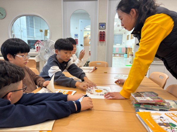 1교시 수업에서는 ‘꼬마악어의 지갑’ 동화를 활용하여 용돈 관리의 기본 개념을 이해하도록 지도하였습니다. 동화를 읽어 주는 과정에서 중요한 장면에서는 목소리와 속도를 조절하며 학생들의 흥미가 지속되도록 하였고, 꼬마악어가 지갑 속 돈을 어떻게 나누어 사용하는지에 대해 질문을 제시하여 집중을 유도하였습니다. 특히 ‘혼자 쓸 돈, 함께 쓸 돈, 저금할 돈’이라는 세 가지 경제 개념을 설명한 뒤, 동화 속 장면과 연결하여 각각이 어떤 상황에서 사용되었는지를 예로 들며 개념 이해를 도왔습니다.