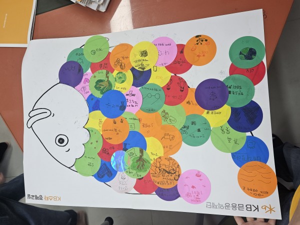 4) 교육내용 : 8차시 수업을 김민서 단원이 주교사로, 저는 보조교사로서 수업을 진행했습니다. 해당 센터에는 개인 테블릿이 없어 메타버스 수업을 '무지개 물고기' 로 대체하였습니다. 무지개 물고기 이야기를 읽고 소중한 것에 대한 토의로 발전시켰고, 물고기 비늘을 꾸며보는 시간을 가졌습니다. 남는 시간에는 지금까지 배운 이자, 금융, 물물교환, 화폐, 예금 등의 개념들을 활용하여 빙고게임을 진행하여 복습할 수 있도록 지도하였습니다.