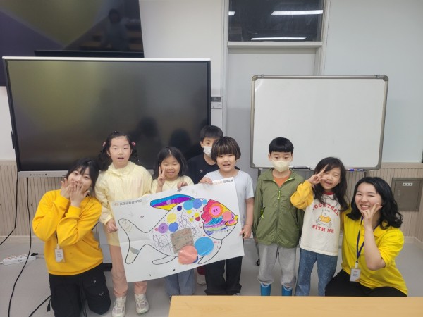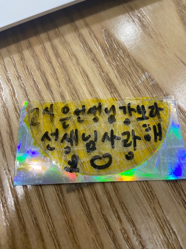 마지막 수업이라 아이들에게 더욱 좋은 기억을 남겨주고 싶었지만, 여전히 장난기가 많아 수업을 진행하기 어려운 순간들이 있었습니다. 무지개 물고기 활동 시간에는 몇몇 아이들이 "이 색종이는 내가 쓸 거야!"라며 다투는 일도 있었습니다. 그럼에도 불구하고 마지막이라는 걸 느껴서였는지, 아이들이 반짝이는 비닐 색종이에 저희에게 편지를 써주었고, 그 마음에 뭉클했습니다. 특히 수업 내내 소극적이었던 아이까지 정성스럽게 편지를 써준 모습을 보고 정말 감동받았습니다. 짧지만 참 따뜻하고 소중한 경험이었습니다.