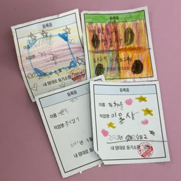 - 2교시: 책의 내용과 관련된 발문 질문을 통해 아이들과 책의 내용을 정리하고 아이들의 사고력을 기름. 이후 책에 나와있는 등록증을 아이들이 직접 만들어보고 직업이 될 수 있는 것과 없는 것에 대하여 학습함.