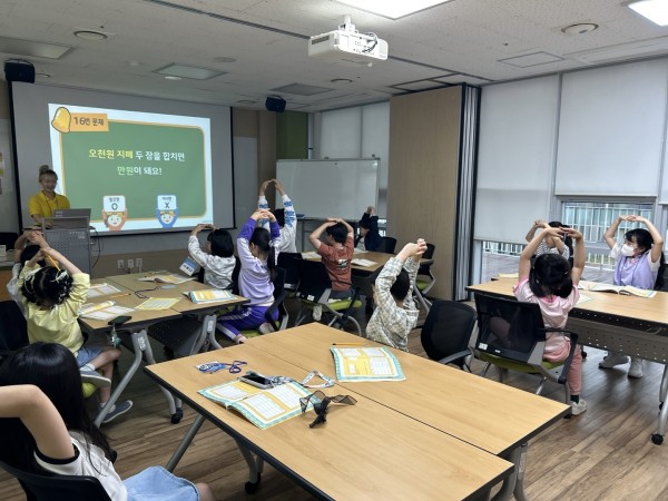 지금까지 배운 내용을 복습하는 총정리 퀴즈를 25문제 구성하여 진행하였다. O/X 문제는 머리 위로 팔을 올려 표시하고, 객관식 문제는 번호를 손가락으로 머리 위에 표현하도록 하여 몸을 활용한 참여를 유도하였다. 문제를 하나 맞힐 때마다 통장에 100원이 저금되는 방식으로 동기를 부여했고, 마지막에는 저축액이 많은 상위 7명에게 칭찬 도장 2개, 나머지 학생들에게는 1개씩을 수여하였다. 게임 진행 시 과열될까 우려했으나, 아이들은 차분하게 문제를 풀었고 서로를 응원하는 모습도 보여주었다. 대부분의 학생들이 문제를 거의 다 맞힐 정도로 지난 수업 내용을 잘 기억하고 있어 강사로서 뿌듯함을 느꼈다.