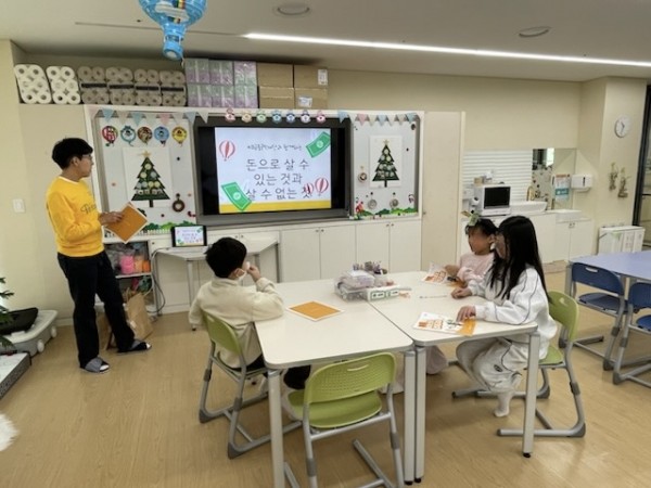 ‘돈으로 살 수 있는 것과 없는 것’을 주제로 수업을 진행했습니다. 교재에 나와있는 돈으로 살 수 있는 물건과 돈으로 살 수 없는 가치 이외에도 추가적으로 발표를 해서 정답을 맞추면 간식을 제공하면서 아이들이 더 적극적으로 참여하도록 진행했습니다.
