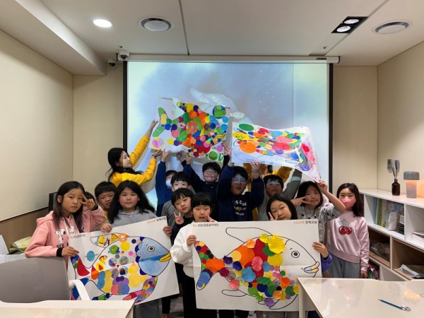 조별로 모여 색종이와 홀로그램 스티커를 이용하여 무지개 물고기 꾸미기를 진행함. 개인별로 나누고 싶은 것, 이전에 나누어보며 기뻤던 기억 들을 적고 발표하는 시간을 가짐