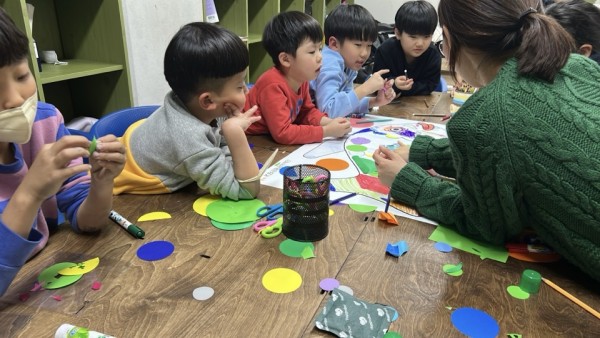 아이들의 연령대가 어려 기존에 계획되어있는 메타버스 프로그램 대신 무지개 물고기 도서 프로그램을 함께 읽으며 자유롭게 물고기도 꾸며보고 나눔의 의미와 중요성을 알아보았습니다. 물고기를 만들 때도 서로 협력을 해가며 친구가 꾸미고 싶어하는 방식을 존중하는 형태로 색종이와 싸인펜 등으로 다양하게 꾸미는 활동을 해보았습니다.