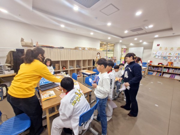꼬마악어의 지갑을 설명할 때는 고민이 많았습니다. 단순히 선생님이 혼자 책을 읽는 것은 친구들이 지겨워하기 쉽기 때문입니다. 그래서 꼬마악어의 지갑을 읽어주는 유튜브 영상을 틀어줄까 고민했었는데 그것 또한 소통하는 수업이 아니라 그저 '일방적인 전달'로 끝나는 수업이 될 수 있기에 소통하는 수업을 지향하는 폴라리스 봉사단의 정체성을 헤칠 수 있다고 생각했습니다.그래서 저는 [연극]이라는 방법을 사용했습니다. 각 등장인물을 간단히 소개하고 친구들에게 연극처럼 실감나게 읽어줄 것을 당부했습니다. 어린 친구들도 연극이라고 생각하니 훨 생동감있고 집중하여 책을 읽는 모습을 보였습니다. 또한 책을 읽고 난 뒤에는 비타민을 주는 퀴즈를 할 것임을 공지해 친구들을 집중 시켰습니다.
