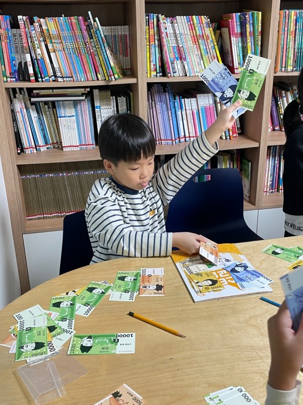 교재와 화폐 교구를 나누어주고 돈의 크기에 대해 학습하였습니다. 이후 앞선 내용을 토대로 돈의 크기를 비교하고, 세는 것과 관련한 퀴즈를 진행하였습니다.