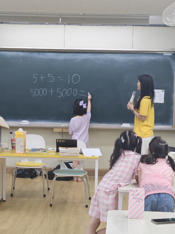 추가로 혜란님께서 아이들 눈높이에 맞춰 '5,000원+5,000원=10,000원' 이라는 것을 차근차근 알려주면서 아이들이 자연스럽게 참여하도록 유도한 점이 인상적이었습니다. 앞으로도 칠판을 적극 활용할 예정입니다.