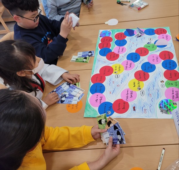 직접 만든 보드게임을 통해 학생들이 경제 개념을 즐겁게 경험하는 모습을 보며 학습자의 흥미와 몰입이 배움을 강화한다는 점을 다시 확인하였습니다. 특히 소비와 저축을 선택하는 과정에서 스스로 판단하며 책임감을 느끼는 모습, 이자 개념처럼 다소 생소할 수 있는 내용도 게임을 통해 쉽게 이해하는 모습을 보며 큰 보람을 느꼈습니다. 마지막 수업에서 학생들이 배운 내용을 실제 상황과 유사한 맥락에서 활용하고 의미 있게 마무리할 수 있어 만족스러웠으며, 앞으로도 이러한 체험 중심 수업을 지속적으로 확장하고 싶다는 생각을 가지게 되었습니다.