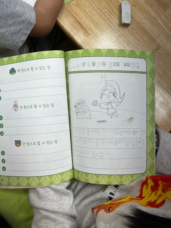 2교시 - 물건을 살 때 해야하는 고민에 대해 발표하는 시간을 가졌습니다. 아이들이 직접 했던 고민이나 할 고민을 나누며 서로 공감하는 시간이었습니다. 돈 조합하기 게임을 하며 아이들이 한 가지 이상의 방법을 생각해낼 수 있게끔 지도했습니다. 마지막으로 경제일기를 쓰며 아이들의 소비생활을 되돌아보는 시간을 가졌습니다.