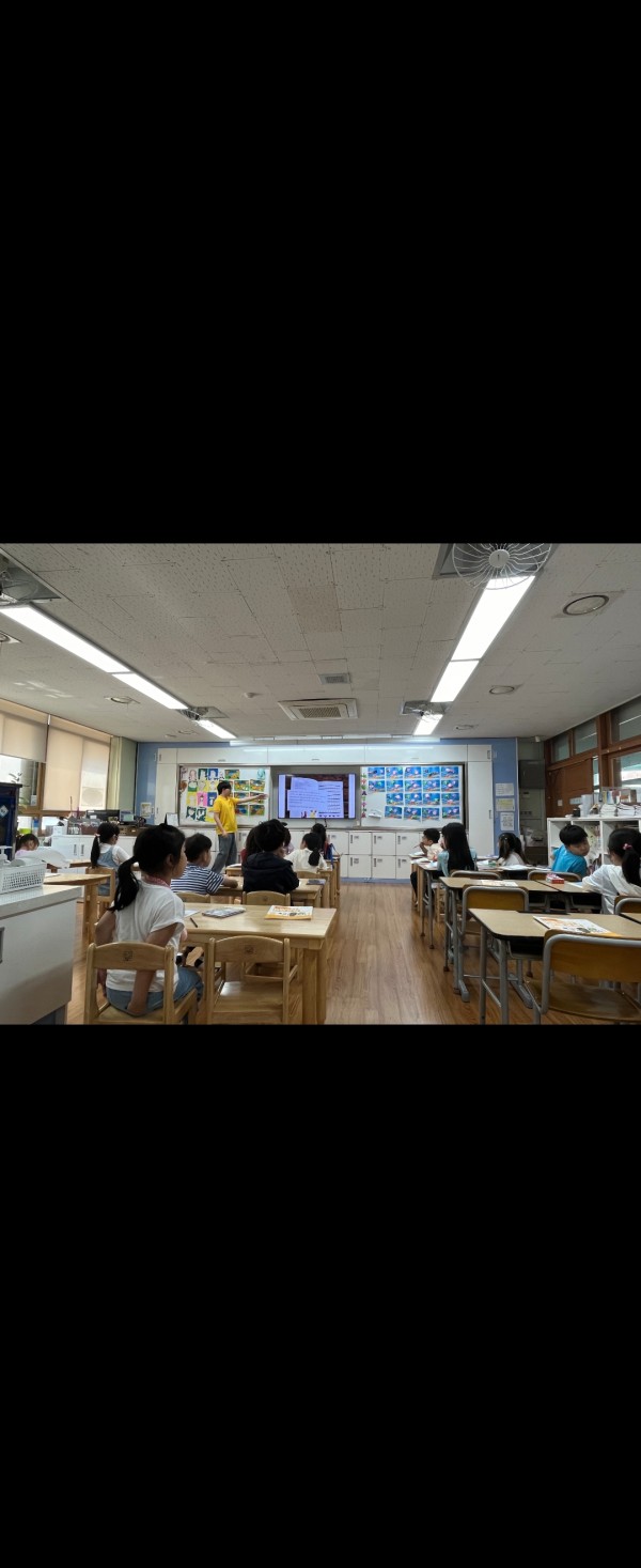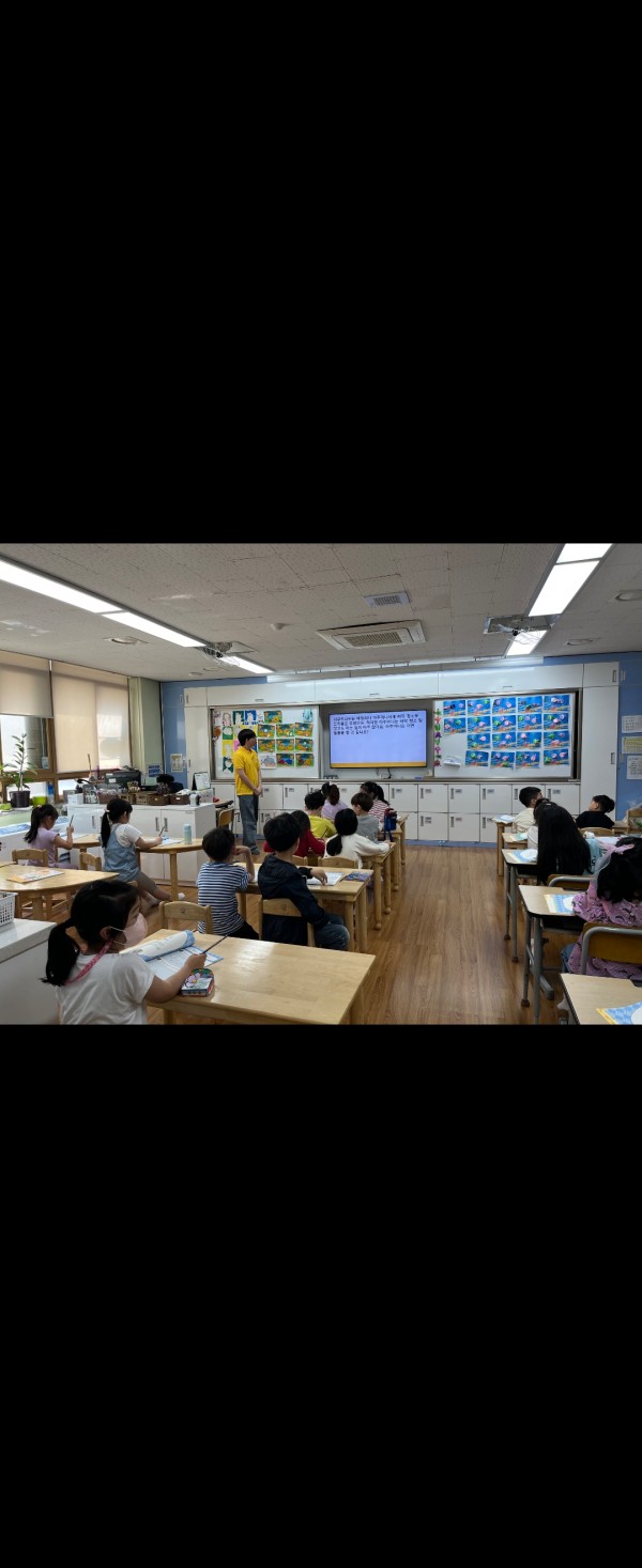 1교시 수업을 시작하기 전 저번 수업시간에 했던 내용을 퀴즈형태로 잠시 복습을 하고 수업을 진행했습니다. 이번 주차시가 책을 읽어주는 시간이 대부분이기에 시간 조절을 하는 것이 많이 중요했습니다. 책의 내용이 초등학생 1학년에겐 상당히 어려운 내용으로 보여 최대한 이해하기 쉽게 추가 설명을 하면서 수업을 진행하려고 하였습니다. 뒤에 질문을 위해서도 학생들이 내용을 이해하는게 필요해 궁금한 점이 생기면 질문을 받아 설명을 하고 페이지마다 내용을 제가 다시 질문해 수업에 집중하도록 만들었습니다. 이와같은 노력에도 불구하고 많은 학생들이 책의 후반부에 집중력이 흐트려지고 내용을 이해하는것에 많은 어려움을 느껴 1교시를 책을 끝으로 쉬는 시간을 가졌습니다.