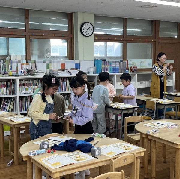 이후 2교시는 활동지에 있는 돈 빈칸채우기 활동과 그 돈을 활용해 머리띠를 만들어 게임을 진행했습니다. 돈 빈칸 채우는 것이 오래걸리는 친구들이 종종 있어 도와주러 다님과 동시에 숫자-한글-영어 순으로 우선순위를 정해주어 숫자라도 먼저 적을 수 있도록 지도했습니다. 그 후 머리띠를 만들 때 아이들이 깔끔하게 돈을 떼어내는 것을 힘들어해 종이 돈이 찢어지는 경우가 매우 많아 테이프를 들고 다니면서 붙여주는데 오랜 시간이 걸렸습니다. 돌봄교실 특성상 왔다갔다 이동하는 아이들이 있어 팀을 나누지 않고 모두가 한팀인 협동게임 형태로, 교실 앞 공간이 넉넉하지 않아 앞으로 나오는 형태가 아닌 자리에서 일어나는 형태로 변형하여 게임을 진행했습니다. 모두 큰 돈 머리띠를 만들거나, 작은 돈 머리띠를 만들면 풀지 못하는 게임 번호가 있음을 알려주어 다양한 돈 머리띠를 만들게 했고, 실제로 작은 돈 머리띠가 부족해 풀지 못한 게임은 이래서 다 같이 게임할 때는 양보도 필요하다고 설명하며 넘어갔습니다. 그러자 뒤 문제에는 본인만 일어나지 않고, 아까 일어나지 못한 친구에게 게임에 참여할 기회를 양보하는 등의 모습을 보여주는 친구들도 있었습니다.