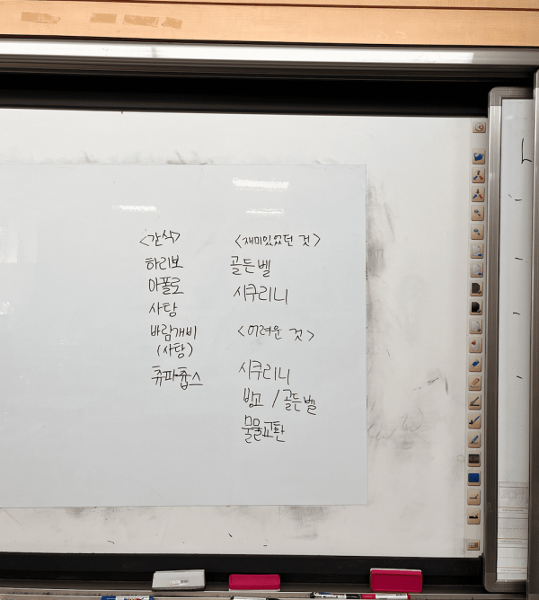 이서윤 단원은 수업을 보조하는 역할을 맡았습니다. 수업 이전 준비물을 챙겨서 수업 진행을 도왔고, 활동 관련 교구를 배부하는 등의 도움을 주었습니다. 퀴즈를 맞추거나, 수업에 적극적으로 참여하는 친구들에게 마이쮸를 배부해주었습니다. 또한, 소극적인 학생들이 수업에 잘 참여할 수 있도록 세심히 돌봤습니다.