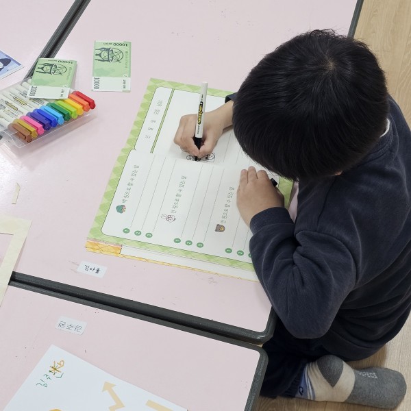 다만, 아이들이 돈을 이해하는 개념이 부족하고 며칠을 일해야 얼마를 벌 수 있을지에 대한 개념을 어려워하는 모습을 보여주었습니다. 그래서 시간이 늦어지더라도 아이들에게 천원이 5장 모이면 5천원과 같다는 개념들을 차근차근 하나씩 함께 이야기해보는 시간을 충분히 가졌더라면 아이들의 이해도 측면에서 훨씬 도움이 되었을 것 같다는 생각이 들었습니다. 다음 수업시간에는 이러한 설명 부분을 좀 더 쉽게 이해할 수 있도록 준비하겠습니다.