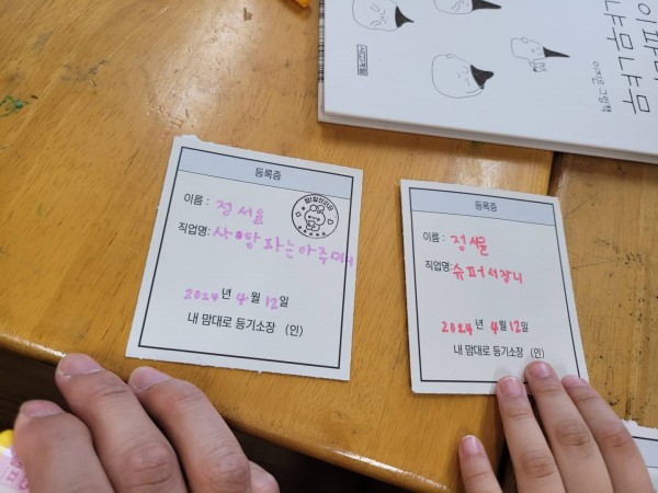 아이들과 함께 등록증을 만들고 직업이 될 수 있는 것과 없는 것에 대해 알아보고