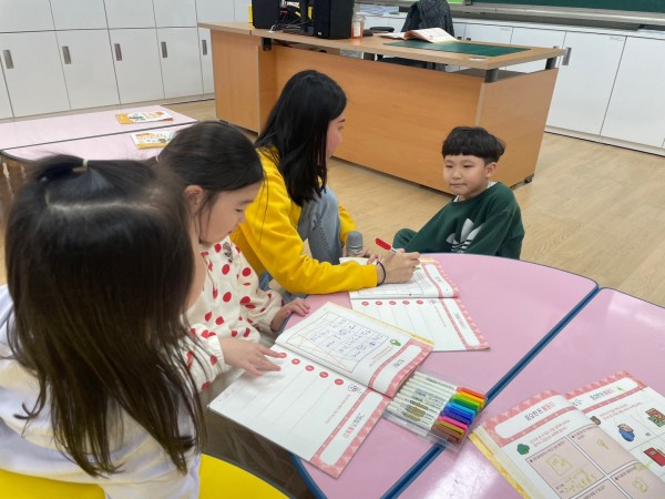 먼저 아이들과 인사를 나눈 후 활동지를 펴고 수업을 진행했습니다. 아이들이 지난 회차보다 더 적극적으로 수업에 참여해주어 돌아가며 발표를 하고 서로의 이야기를 나누는 시간을 가졌습니다.