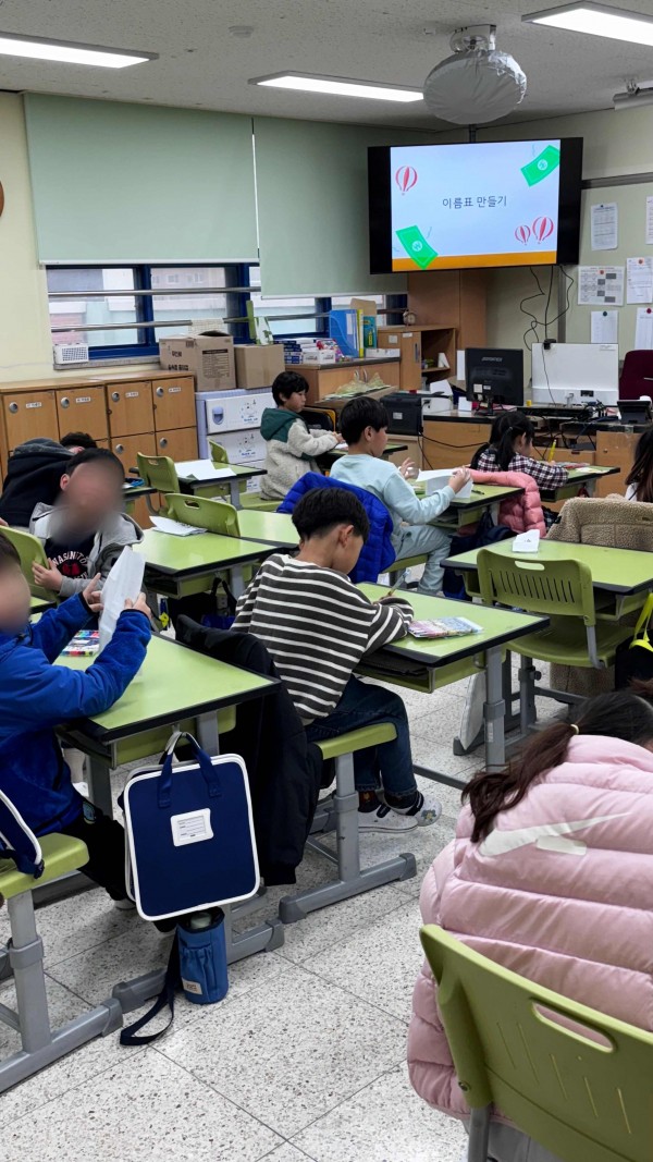 문지원 단원님께서 수업을 진행해주셨고, 진희원 단원이 보조했습니다. 아이들의 이름표가 많이 헤져있거나 이름표를 아예 잃어버린 아이들이 있어 수업 초반 10분 경은 이름표 만들기 활동을 진행했습니다. 이후에는 '단정한 마을의 단정한 시쿠리니씨' 책을 읽어주었습니다. 책을 읽어주는 동안 아이들이 잘 집중해주어 스토리텔링에는 큰 어려움이 없었습니다. 멀리 앉아 있는 아이들의 경우 PPT가 잘 안 보인다는 말을 해주기도 하여 개인적으로 아쉬움이 좀 남았습니다. 아이들이 등록증 만들기 활동에 아주 적극적으로 참여해주었습니다. 각자 미래에 원하는 직업을 적으라고 하니 의욕이 넘쳤던 것 같습니다. 직업의 중요성을 재밌게 알려줄 수 있었던 활동이었습니다.