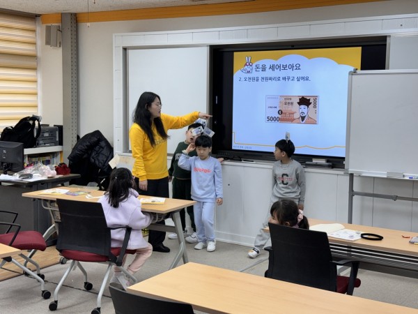 1교시: 아이들에게 화폐가 탄생하기 전 물물교환을 통해서 거래가 이루어줬고, 물물교환의 불편함과 화페의 편리함을 알려주었습니다. 또한 화폐의 생김새를 알아보며 미래의 화폐를 직접 그려보는 활동을 진행하였습니다
