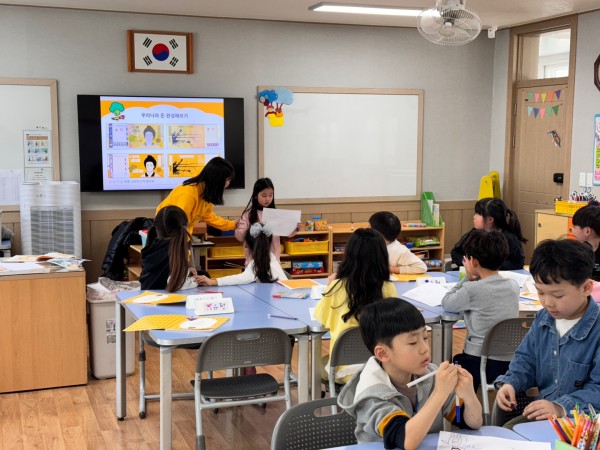 김진솔 단원이 수업을 진행했습니다. 화폐가 없던 시절 물물교환을 통해 거래가 이뤄졌다는 내용을 알려주고 물물교환의 불편함을 알려주었습니다 . 또한 돈의 모습을 직접 그려보며 돈의 중요성을 알려주었습니다.
