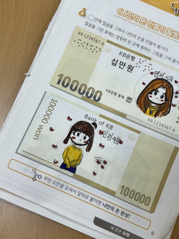 2교시에는 권민지 단원이 교재에 나오는 나만의 지폐 만들기 활동을 진행하였습니다.