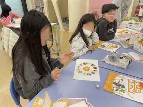 ‘용돈을 사용하고 저축하기’ 활동에서는 모형 돈으로 용돈 10000원씩을 나누어주고 주사위를 굴려 원판에 있는 물건 카드를 구매하는 게임을 진행했습니다. 활동을 하면서 저축의 중요성 뿐만 아니라 거스름돈을 잘 거슬러 받는 것까지 진행하여 아이들이 돈 계산을 하는 법도 훈련할 수 있도록 진행했습니다. 처음에 주사위를 굴렸을 때 별로 원하는 물건이 없음에도 구매했다가, 다음 턴에서 원하는 물건이 있는 칸의 숫자가 나왔을 때 돈이 없어서 구매하지 못하는 상황에서 저축의 중요성을 교육할 수 있었습니다.