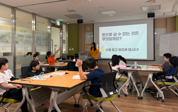 1교시에는 학생들에게 ‘돈으로 살 수 있는 것과 없는 것’에 대해 가르쳤다. 먼저 활동지로 학생들이 갖고 싶은 물건과 그 물건의 구매 장소, 필요한 금액을 작성하도록 한 뒤 각자 발표하며 서로의 생각을 공유하게 했다. 이를 통해 학생들이 돈으로 살 수 있는 것과 살 수 없는 것을 구분하도록 지도했으며, 생명, 햇빛, 우정, 사랑 등은 돈으로 살 수 없다는 점을 자연스럽게 인식하도록 도왔다. 이어 팀별 카드 뒤집기 게임을 진행하며 학습 내용을 복습하고 이해를 강화할 수 있도록 유도했다.