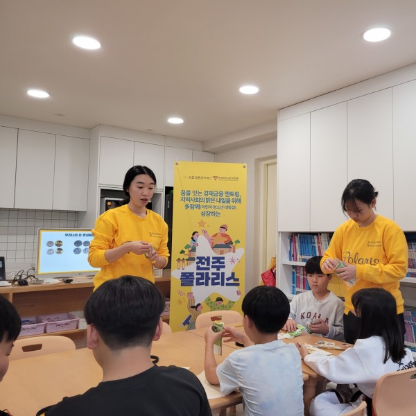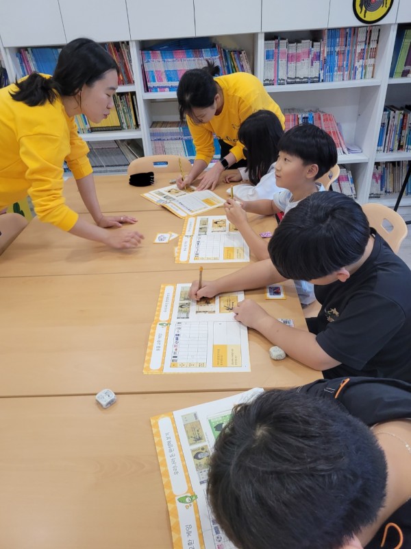 본격적인 수업 시작 전 자기소개, 취미 공유 등을 진행하며 친밀감을 쌓는 시간을 가졌습니다. 그리고 역할을 정해 '사라진 돈' 이야기를 읽으며 화폐가 사라졌을 때의 불편한 점들을 공유해보며 물물교환과 화폐의 개념에 대해 알아봤습니다. 이후에는 직접 카드게임을 통해 물물교환의 불편함과 화폐의 필요성에 대해 알아보는 시간을 가졌습니다. 마지막으로 화폐 머리띠를 만들어 화폐의 실사용에 대해 알려줬습니다.