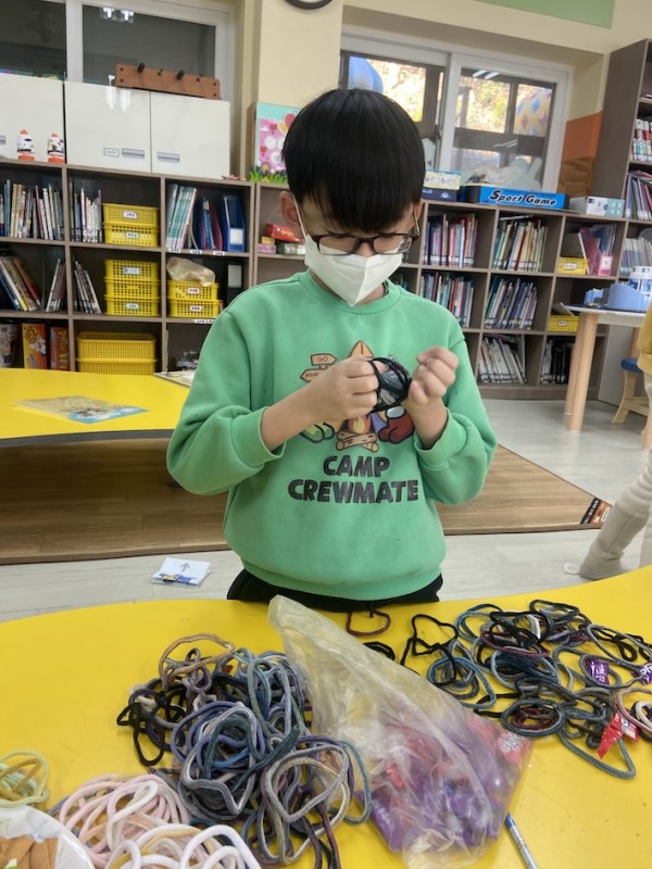 2교시: 활동지를 하면서 짝짝이가 어떤 것이 있는지 얘기했다. 양말목으로 공을 만들어 박스에 넣기 게임을 하며 재활용의 즐거움을 알게되는 시간을 가졌습니다.