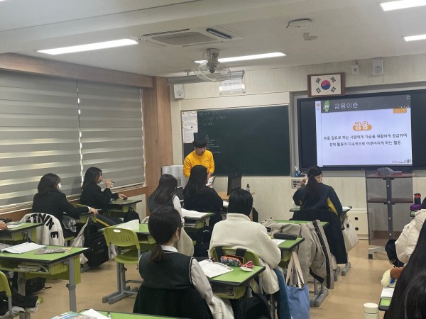 1교시: 최영우 단원이 금융의 의미를 설명하고 다양한 금융기관의 역할,유형 및 이용 방법에 대해 학생들이 이해하기 쉽게 설명했습니다. 그리고 저축의 필요성과 은행의 대표적인 저축상품에 대해 명확하게 설명하였고, 저축과 투자의 차이점이 무엇인지 알아보았습니다. 끝으로 현명한 투자자가 되기 위해서는 다양한 자산에 분산하여 투자해야 함을 강조하였습니다.