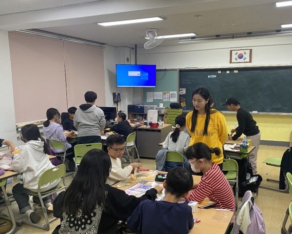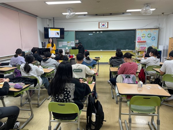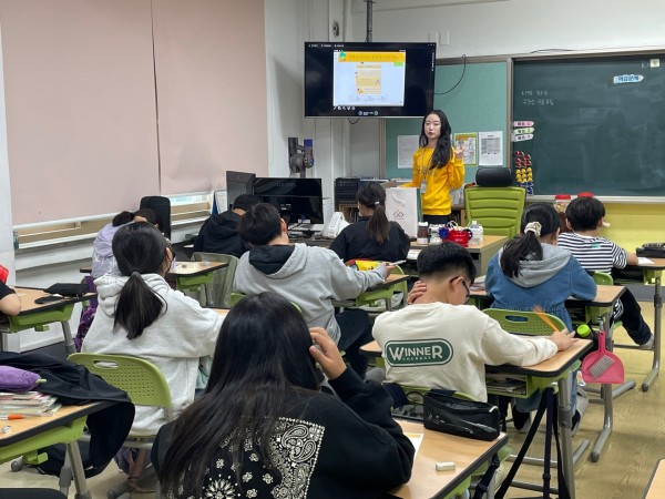 1교시: 김세진 단원이 교재를 가지고, 다양한 금융기관을 설명하며 학생들의 질문을 유도하는 참여형 수업을 진행했습니다. 학생들은 본래 알고 있던 지식과 함께 수업을 통해 금융기관의 종류에 대해 학습했습니다.