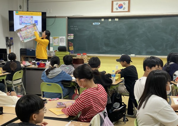 2교시: 조민지 단원이 교구를 가지고, 4명 씩 모둠을 만들어 보드게임을 진행했습니다. 돈이 오고가는 금융의 원리를 자연스럽게 학습하고 투자와 보험의 중요성에 대해 깨달았습니다.