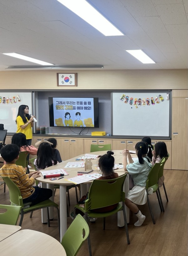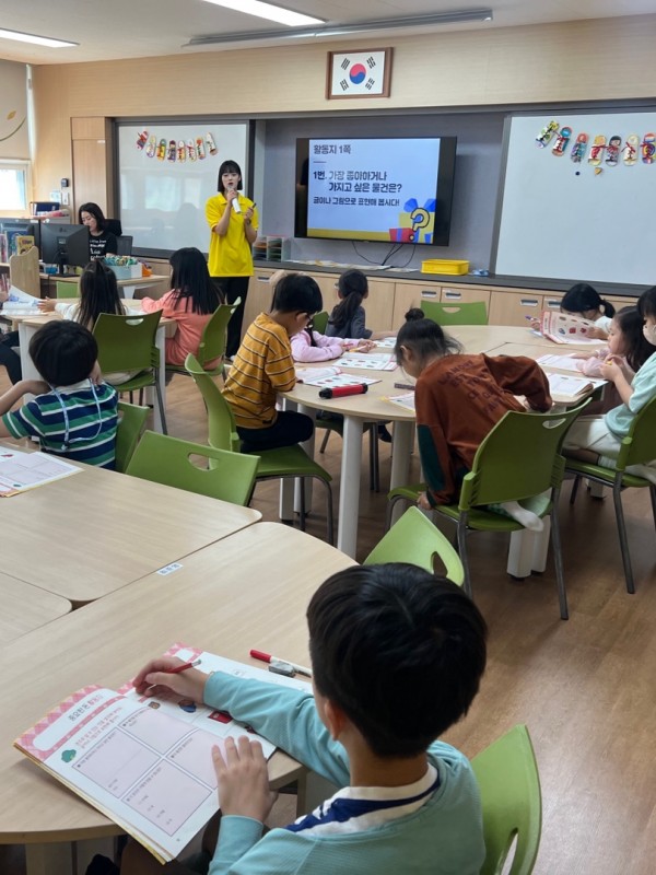장수현 단원은 학습목표를 아이들과 다 함께 말하며 수업을 시작했습니다. 활동지12쪽을 피며 아이들이 작성하는 시간을 주었습니다. 아이들이 자신에게 이야기를 나눌 수 있게 손을 들고 발표하는 시간을 가졌습니다. 12쪽 2번에서 이 물건을 얻기 위해 어디로 가야할지에 대해서도 작성해보며 아이들을 기다릴 동안에는 돌아다니며 정신비 단원과 아이들을 도왔습니다. 12쪽 3번에서는 다같이 돈이라고 말하며 4번에 대해서도 간단하게 발표하는 시간을 가졌습니다. 돈으로 살 수 있는 것과 없는 것에 대해 손을 들고 발표하고 아이들에게 질문을 유도하며 수업을 진행했습니다. 오늘 배운 내용을 말하며 1교시는 마쳤습니다.