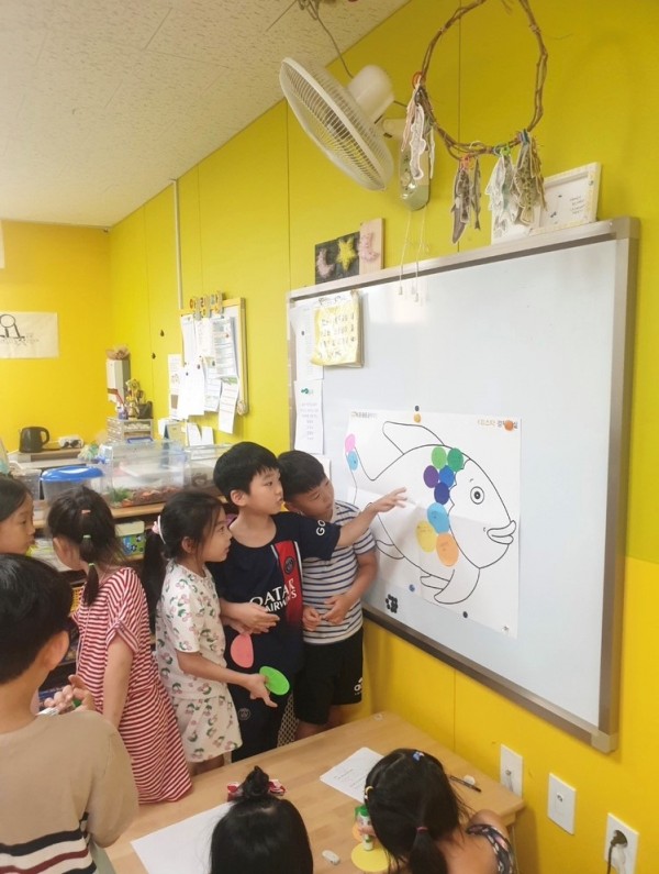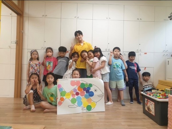 - 1교시 활동을 바탕으로 내가 나눌 수 있는 것들을 색종이에 적어서 붙이며 무지개 물고기를 직접 만들어보았습니다.