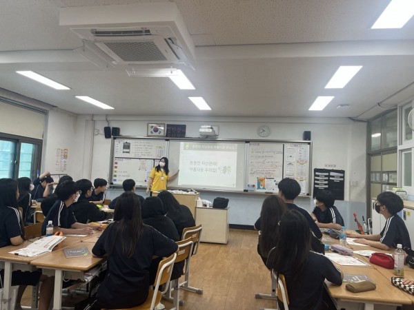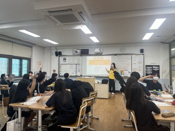 1교시: 한수안 단원이 교재 수업을 하였습니다. 학생들의 수업에 집중할 수 있도록 여러가지 예시를 들며 설명해주었고, 어려운 용어들은 쉽게 풀어 설명해주었습니다.