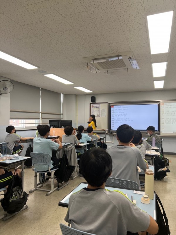 1교시 : 전윤빈 단원이 '금융이 궁금해, 저축과 투자를 부탁해.' 이론 수업을 진행하였습니다. 실제 자신의 저축 사례, 투자 사례를 들며 수업을 진행한 점이 인상적이었습니다. 사례를 통한 설명이 아이들에게 흥미를 불어일으킨다는 것을 알 수 있었습니다.