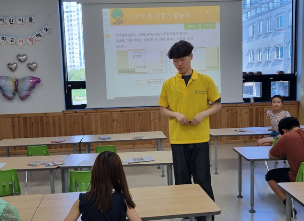 1교시: 최진수 단원이 화폐의 역사, 기본적인 경제 원리, 소비, 저축 투자 등에 대한 기본 개념을 통해서 학생들과 질의응답 시간도 가졌으며, 특히 실제적인 사례를 통해서 경제와 학생들이 앞으로 저축과 투자에 있어서 긍정적인 생각을 갖고 실행할 수 있도록 수업을 진행하였습니다.