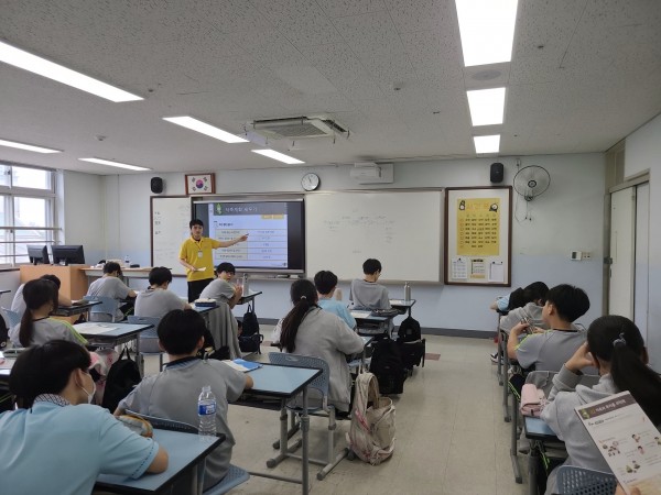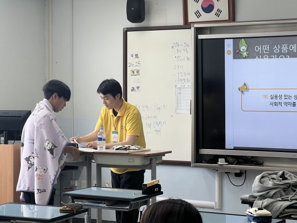 1교시: 조장훈 단원이 ‘금융이 궁금해, 저축과 투자를 부탁해’에 대해 교재수업을 진행했습니다. 학생들이 관심 있어하는 주제인 k-pop을 예시로 들어 수요와 공급, 그리고 대출과 금융 전체로 이어지는 판서를 진행해 이해를 도왔습니다.