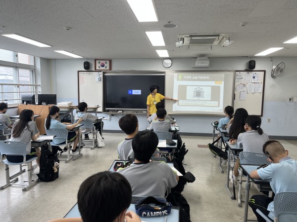 1교시 : 박시현 단원이 금융이 궁금해, 저축과 투자를 부탁해 교재를 활용하여 이론 수업을 진행하였습니다. 아이들이 이해하기 쉽도록 어려운 용어는 퀴즈를 통해 아이들이 뜻을 유추하게 하거나 풀어서 설명해가며 수업을 진행하였습니다.