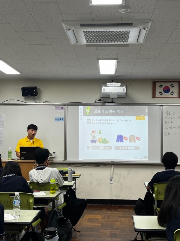 1교시: 김민성 단원이 금융 속담을 통해 아이들의 흥미를 끌며 합리적 소비의 개념 및 저축과 투자의 차이점에 대해서 설명하였습니다.