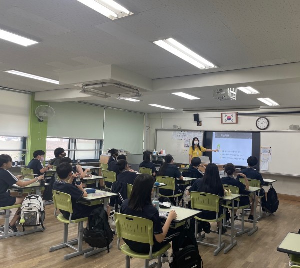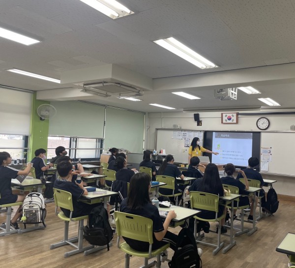1교시: 한수안 단원이 교재 수업을 하였습니다. 본인의 예시를 들어 설명해줌으로써 아이들이 수업에 흥미를 가지고 집중할 수 있도록 하였습니다.