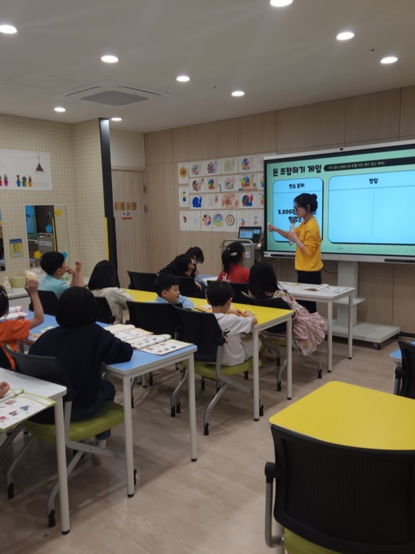 2교시(유채린): 사례를 예시로 들어 가격을 비교하고 돈을 벌기 위해선 시간과 노력이 필요하기에 값이 나가는 물건을 살 때는 고민을 하고 사야한다는 내용을 교육했습니다. 어떤 고민이 필요한가에 대해서 정말 필요한가, 오래 쓸 수 있나, 지금 가진 돈으로 살 수 있나, 정말 가지고 싶나 등 선생님의 경우를 애기하며 이해하기 쉽도록 도왔습니다. 가짜화폐배부 후 돈 조합하기 게임을 진행했습니다. 준비해간 화폐의 천원이 조금 부족하여 1차시 교재에 있는 화폐를 이용했습니다. 이 게임은 선착순이 아니라 모든 팀이 다 맞출 수 있도록 하는 것이 의미 있을 거라 생각하여 아이들에게 승부나는 것이 중요한 게 아니라 완성하는 것이 중요하다고 거듭 말했습니다. 다른 팀이 다 완성할 때까지 기다리며 게임 진행했습니다.