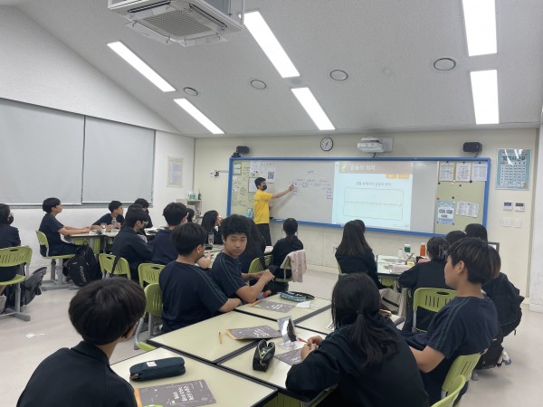 1교시: 앞선 1학년 9반 수업과 마찬가지로 조장훈 단원이 ‘금융이 궁금해, 저축과 투자를 부탁해’에 대해 교재수업을 진행했습니다. 금융의 의미부터 저축과 투자의 종류에는 어떤 것이 있는지 학생들에게 와닿을 수 있는 주제(k-pop)를 바탕으로 한 판서를 통해 설명했습니다.