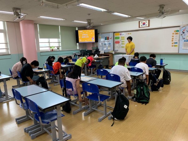 1교시는 강상욱 단원이 진행하였습니다. 아이들의 이해를 돕기 위해서 최대한 아이들의 눈높이에 맞추어서 설명을 하였고 목소리 톤과 말의 빠르기를 신경 써서 진행하였습니다. 아이들에게 꿈을 먼저 물어봤는데 부자가 되고 싶어 하는 학생이 많았고 돈의 기능을 알아보며 돈의 흐름과 쓰임에 대한 이해를 시키기 위한 발표를 진행하고 그 뒤로 합리적인 소비를 위해 원하는 것과 필요한 것에 대한 차이점과 이를 어떻게 하면 합리적 소비로 이어지게 할 수 있을까에 대한 내용을 설명해 주고 아이들이 직접 책에 있는 내용을 바탕으로 작성하고 발표하며 운동감각 학습을 유도하였습니다.