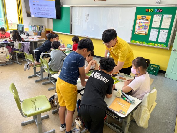 2교시는 골든벨 퀴즈와 교구를 이용한 보드게임을 통해 돈을 벌어요 활동지 수업을 진행했습니다. 누구나 쉽게 참여하기 위해 모둠마다 박도현 단원이 돌아가면서 어려운 내용과 규칙을 설명하여 빠지는 인원없이 함께 게임 수업을 진행했습니다.
