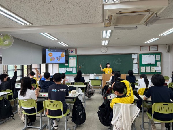 1교시 : 서지은 단원이 '금융이 궁금해, 저축과 투자를 부탁해.' 수업을 진행했습니다. 금융 용어들이 어려울 것이라 생각해서 한자어의 뜻풀이를 통해 친숙하게 느낄 수 있게 했습니다. 예를들어 채권은 ‘빚 문서‘, 여신은 ‘신용을 주고받는 것’ 이라고 설명했는데 학생들이 쉽게 이해하는 모습을 볼 수 있었습니다.
