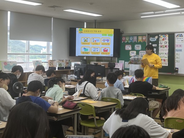 1교시는 조희진 단원이 진행했습니다. 금융기관의 뜻과 종류를 설명하고, 저축과 투자의 차이를 알기 쉽도록 설명하기 위해 노력했습니다.