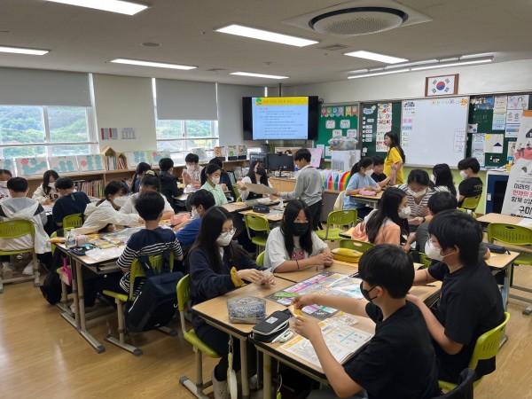 2교시는 서가빈 단원이 진행했습니다. 조를 만들기 전 교구에 대해 설명한 뒤 게임 방법에 대해 알려주었습니다. 게임을 시작한 뒤 교실을 돌아다니며 학생들이 잘 참여할 수 있도록 도왔습니다.