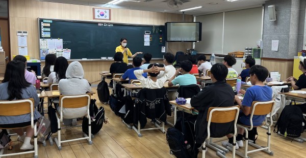 2교시는 최윤채 단원이 진행했습니다. 조를 만들기 전 교구에 대해 설명한 뒤 게임 방법에 대해 알려주었습니다. 그 후 조별로 자리를 만들도록 하였고, 이미 학급에 조가 만들어져 있어 학생들이 쉽게 조를 만들어 게임을 진행할 수 있었습니다. 게임을 시작한 뒤 교실을 돌아다니며 학생들이 잘 참여할 수 있도록 도왔습니다.